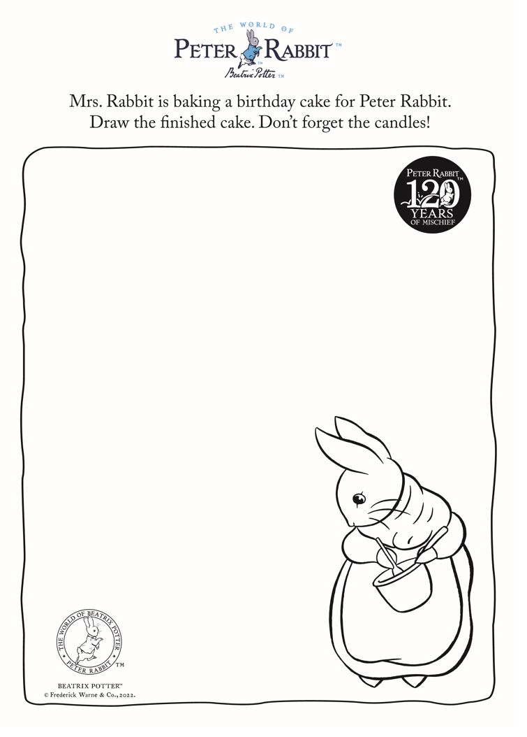 Mrs. Rabbit is baking a birthday cake for Peter Rabbit. Ask your little one to draw and colour in the finished cake. Don’t forget the candles!