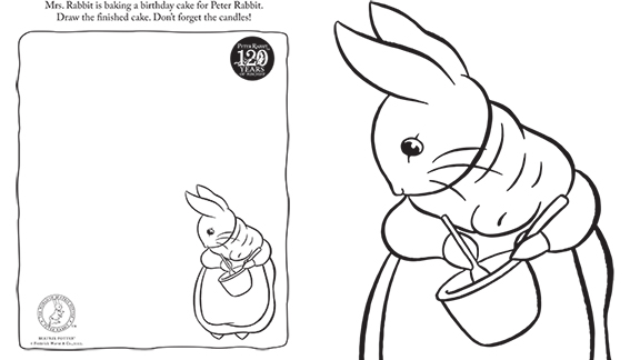 Mrs. Rabbit is baking a birthday cake for Peter Rabbit. Ask your little one to draw and colour in the finished cake. Don’t forget the candles!