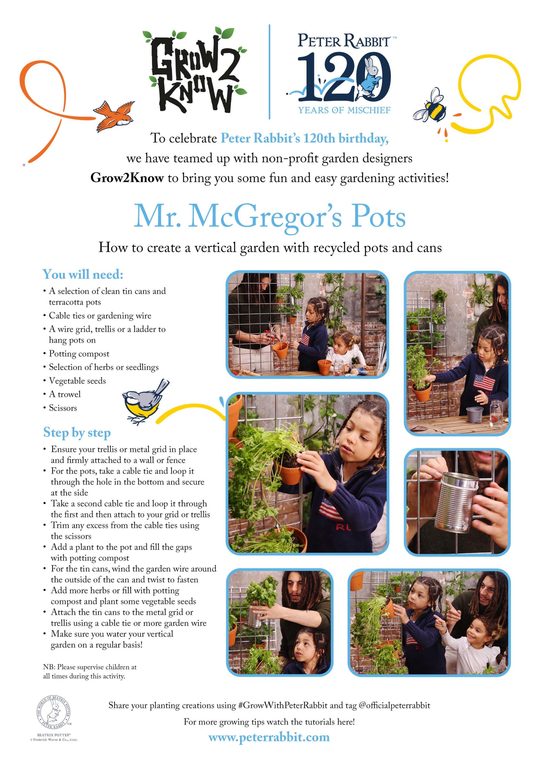 Grow2Know are bringing your little bunnies fun and easy gardening activities in celebration of Peter Rabbit's birthday. Learn how to create a vertical garden with recycled pots and cans.